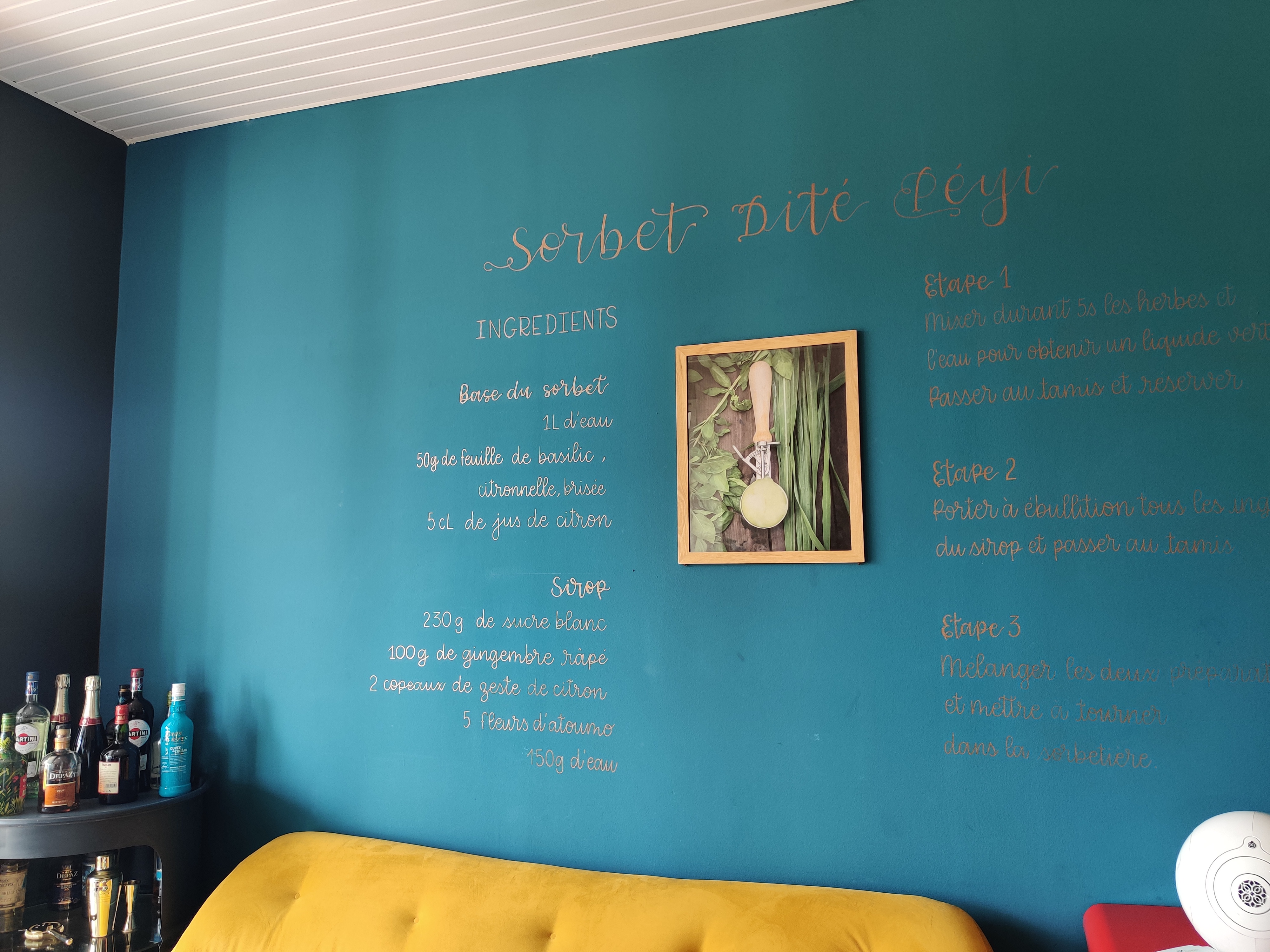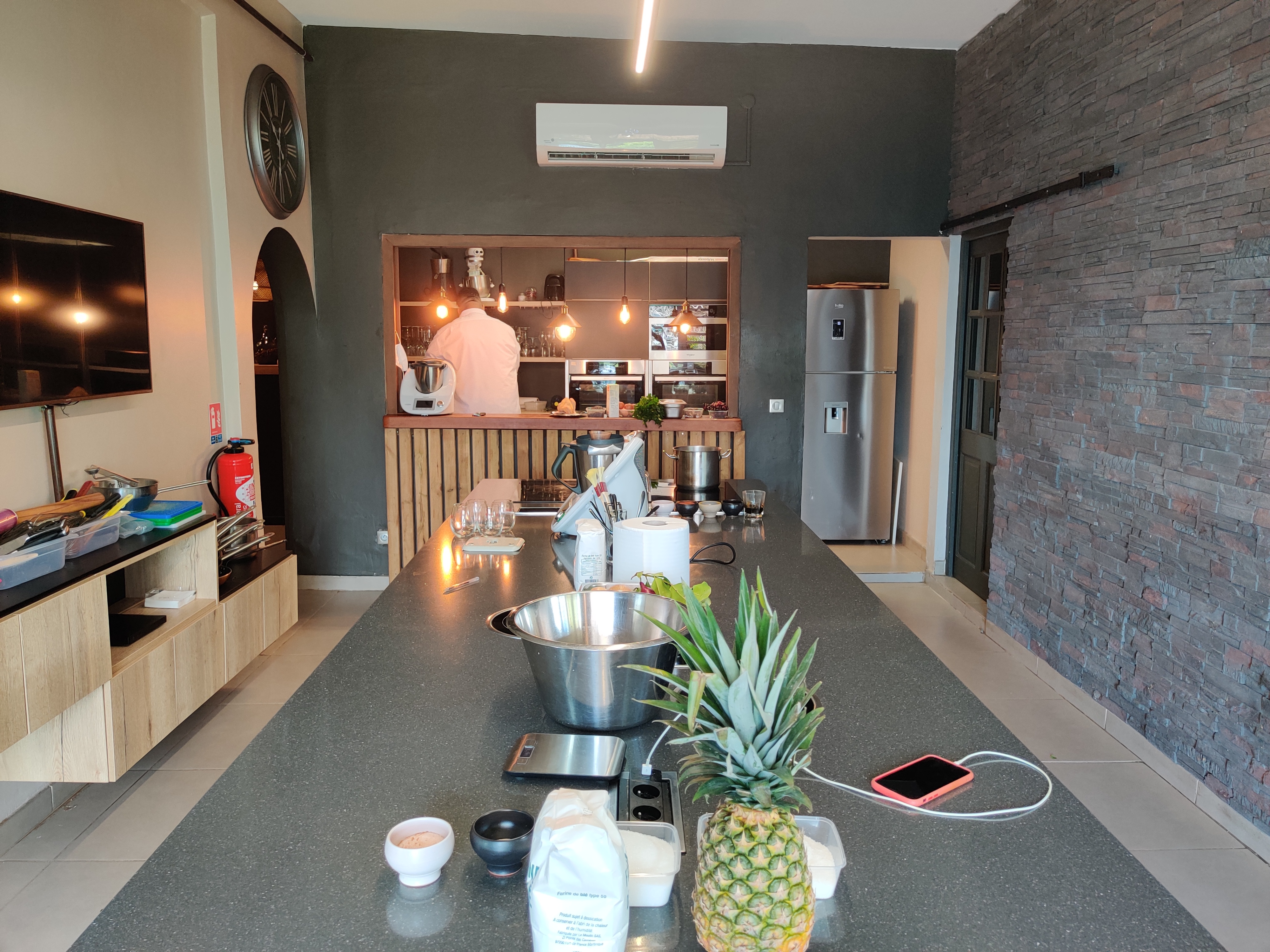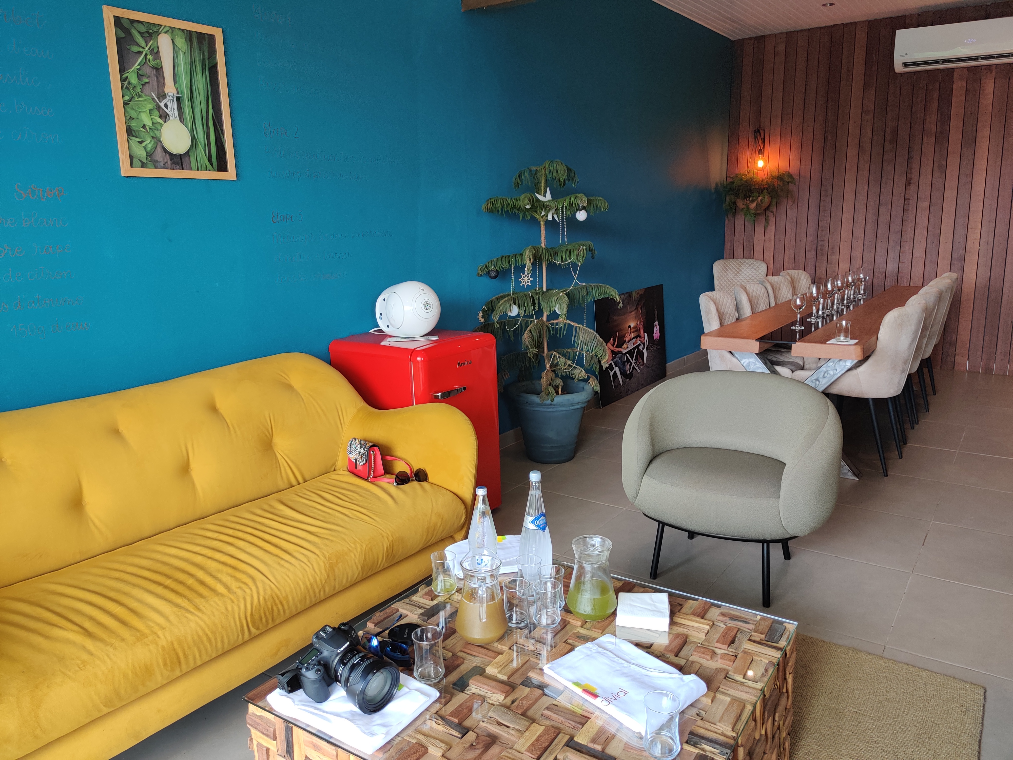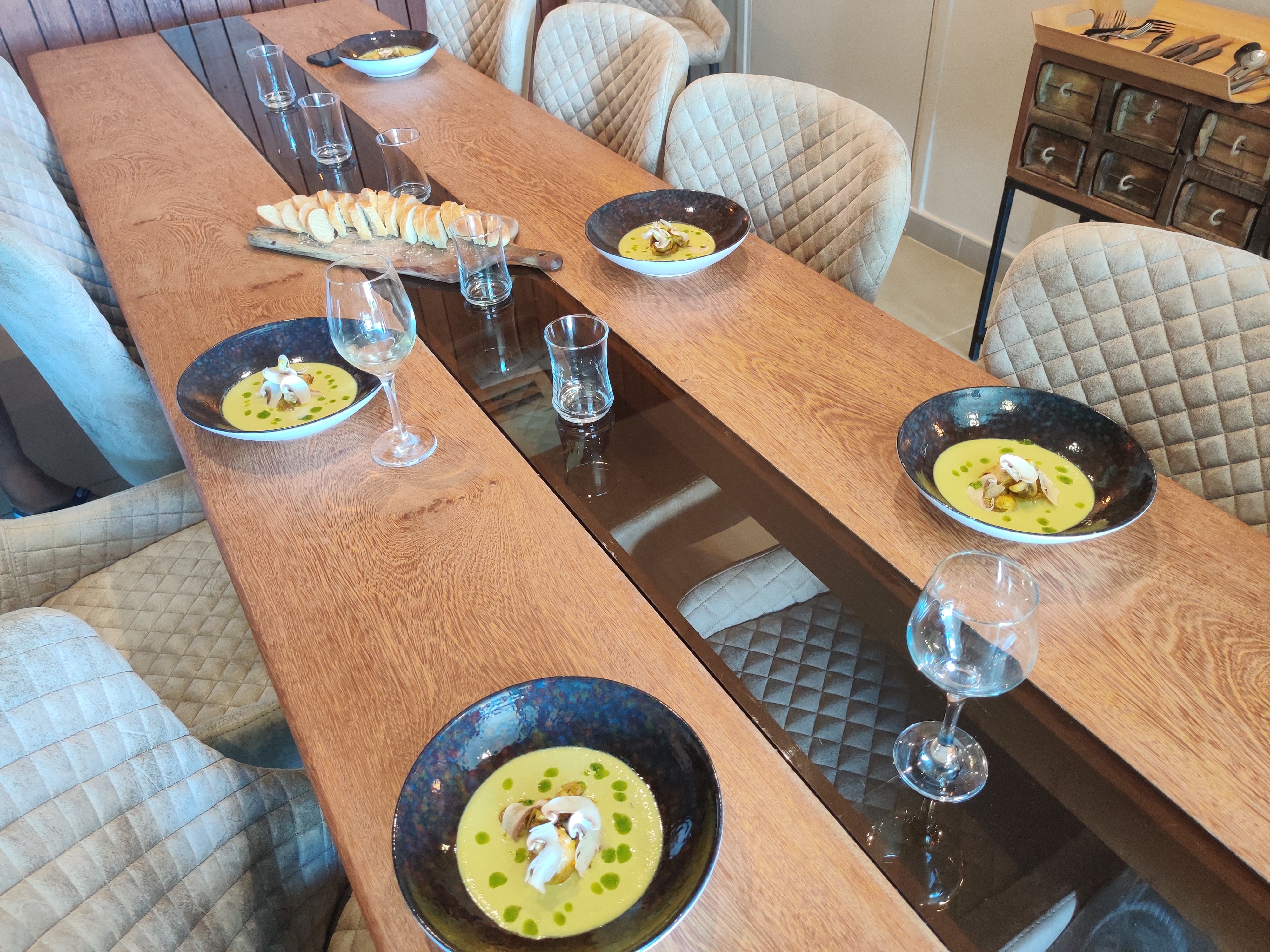 Nous avons rapidement fait connaissance autour d’un pot de bienvenu (jus de canne et prune de cythère très doux). Plongés dans le décor du lieu, nous savourions déjà la chance d’être sur place. Ambiance feutrée et intimiste, musique lounge, nous n’attendions plus que le Chef ! 🤗