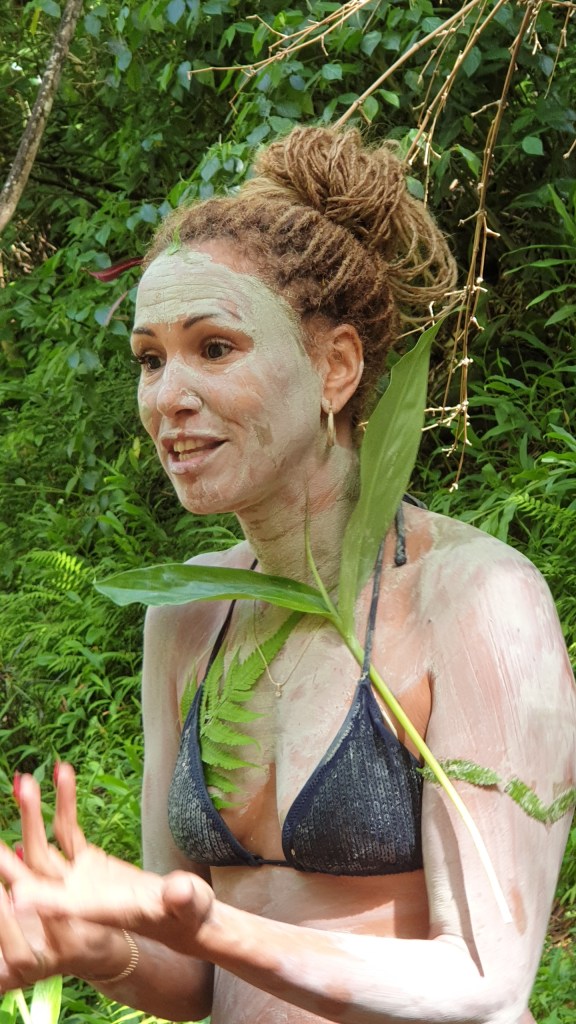 Avec la présentation de notre guide du jour, c’est une ode au bien être, au retour aux traditions, au naturel qu’on expérimente littéralement. Elle nous remet à chacun un peu d’argile enrichi avec de l’huile essentielle à appliquer sur nous, d’où l’intérêt du maillot 2 pièces.