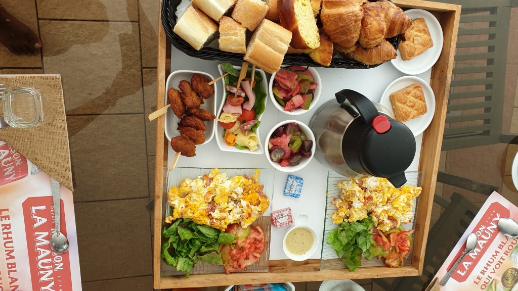 Pour le petit déjeuner, nous optons pour la formule brunch. Vous constaterez qu’il est bien garni ! Le chocolat est fait maison, avec de la laitue du jardin, les œufs du poulailler, idem pour la goyave…Delicious.