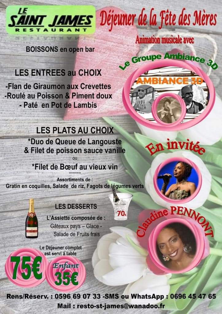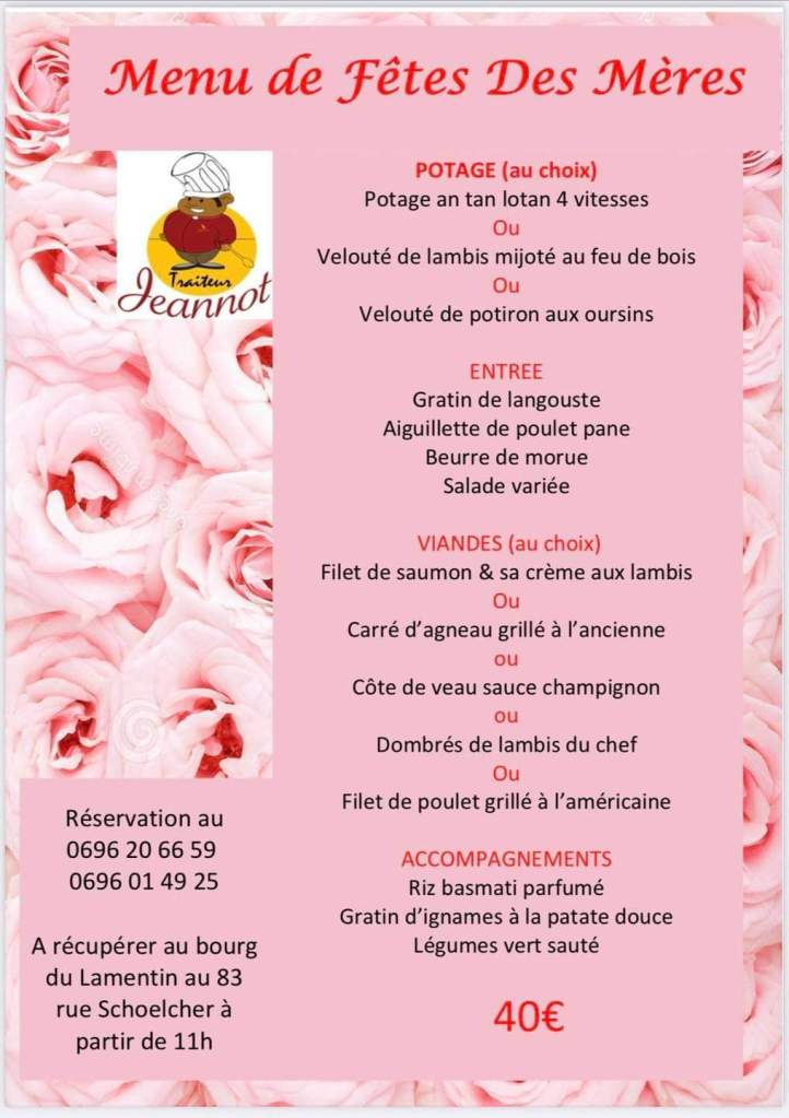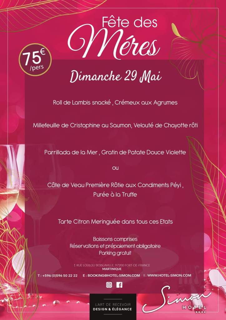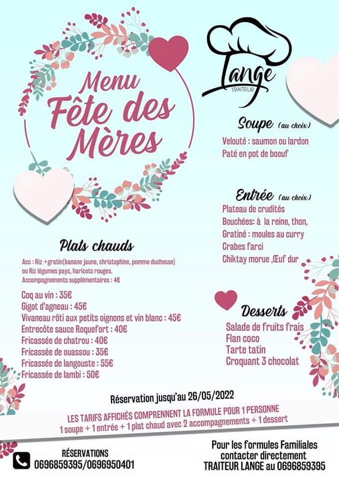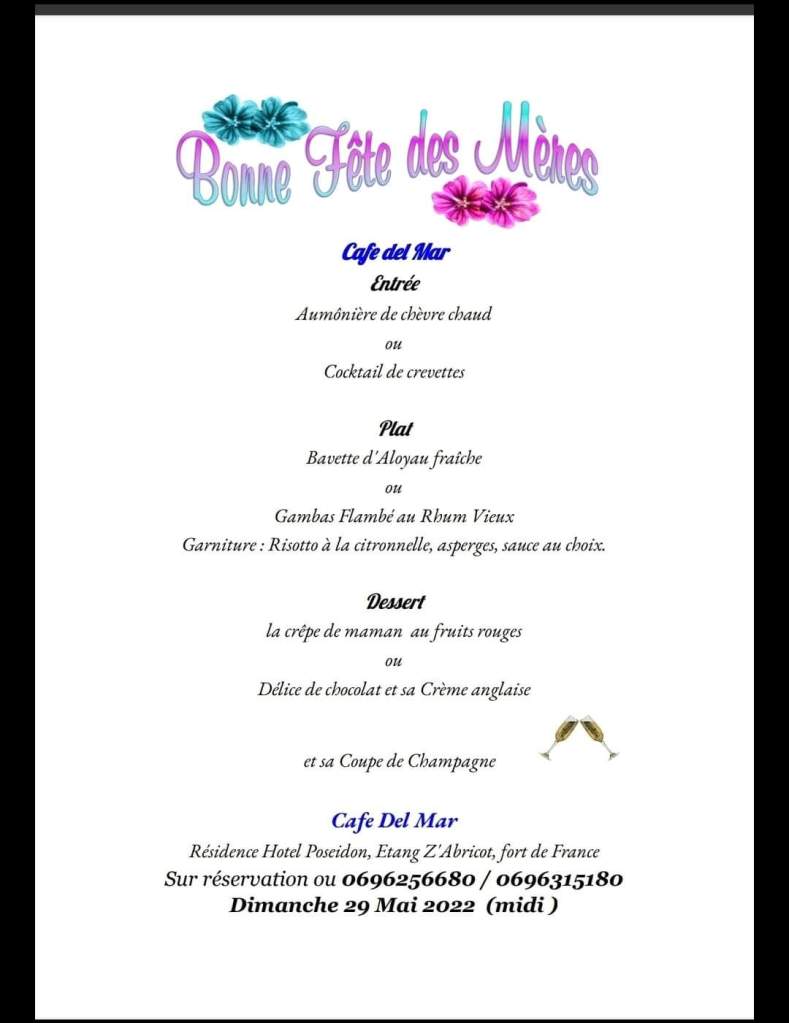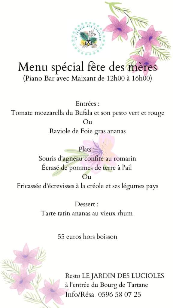 Le moulin hydroélectrique du Gros Morne vous prépare un animation de 12h00 à 20h00 avec un déjeuner et Orlane et Richard Exurville en invité (décidemment, Orlane sera partout pour dimanche de fête des mères !). Il y aura un concours du plus beau poème et une coupe de champagne est offerte à chaque maman. En entrée, il y aura un crémeux de patate douce à la morue grillée, des crevettes pannées au manioc avec une sauce aigre douce. En plat des côtelettes de mouton ou un vivaneau farci au lambis sauce tartare, vous pourrez les accompagner de gratin de toloman, riz madras, ou d’achard de légumes. En dessert il y aura du diri doux, de la tarte tatin banane avec sa boule de glace au manioc. Le tarif sera de 60€ et vous pouvez réserver au 0696 23 66 42.