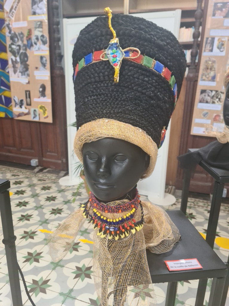 C’est donc avec curiosité et beaucoup d’enthousiasme que je me suis rendue à la Bibliothèque Schoelcher voir l’exposition de cette classe de CAP Métiers de la coiffure. Il s’agit d’un projet réalisé dans le cadre du chef d’œuvre (une réalisation collective qui permet aux élèves d’exprimer leurs compétences en lien direct avec leur cœur de métier). Les élèves sont partis à la découverte des coiffures crépues depuis la préhistoire.