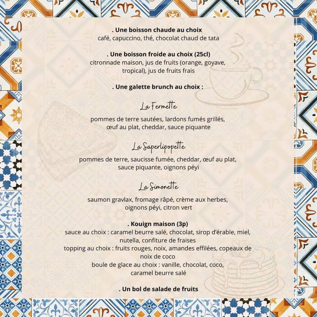 Alors pas une seconde à perdre, on passe un coup de fil à Tata au 0596 78 05 49 ou on réserve en ligne. Le contenu du brunch pour vous donner envie :
