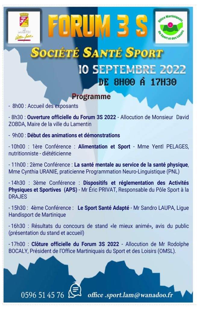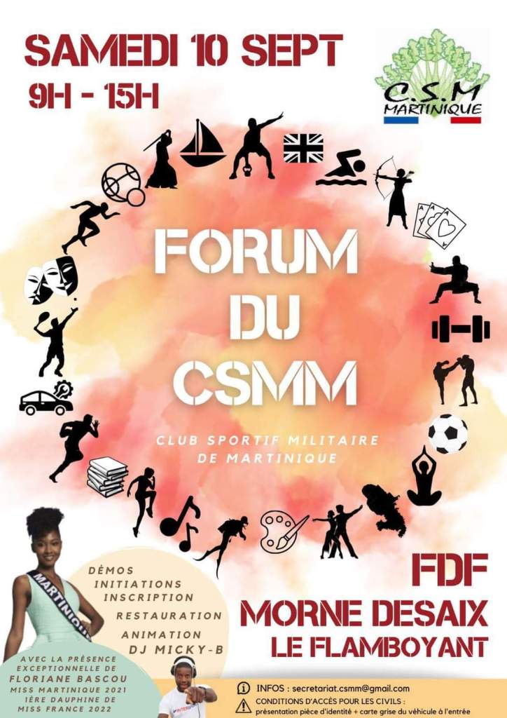 La Ville de Fort-de-France et ses partenaires vous attendent pour la rentrée des associations sportives ! Venez choisir, tester et vous inscrire à une activité sportive de 13h à 17h30 sur le Malecon, la Savane et la Plage de la française. Au programme : des stands découverte, des animations et ateliers. Informations au 0596 39 31 02.