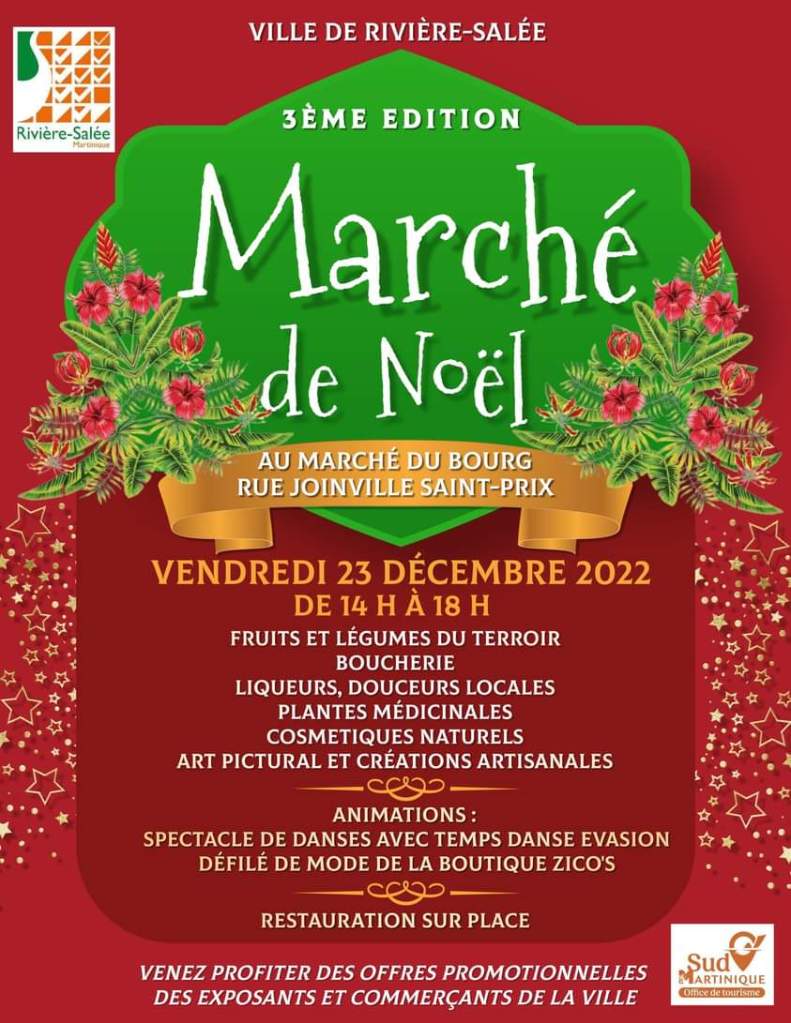 De 15h à 22h, retrouvez le village culinaire de fin d’année intitulé « 𝗟𝗘𝗦 𝗙𝗘́𝗘́𝗥𝗜𝗘𝗦 𝗗𝗘 𝗟𝗔 𝗣𝗟𝗔𝗖𝗘 𝗝𝗢𝗬𝗘𝗨𝗦𝗘 » à Trinité. Parée de ses plus belles lumières et pour le plus grand plaisir des fins gourmets et des petits et des grands, la commune accueillera un village d’animation aux couleurs de Noël avec des stands gourmands, show culinaires, défilés, animation etc… En clôture, il y aura un Chanté Noël avec Robert Mavouza et le groupe Bakwa nwel. Infoline au 05 96 58 20 12.