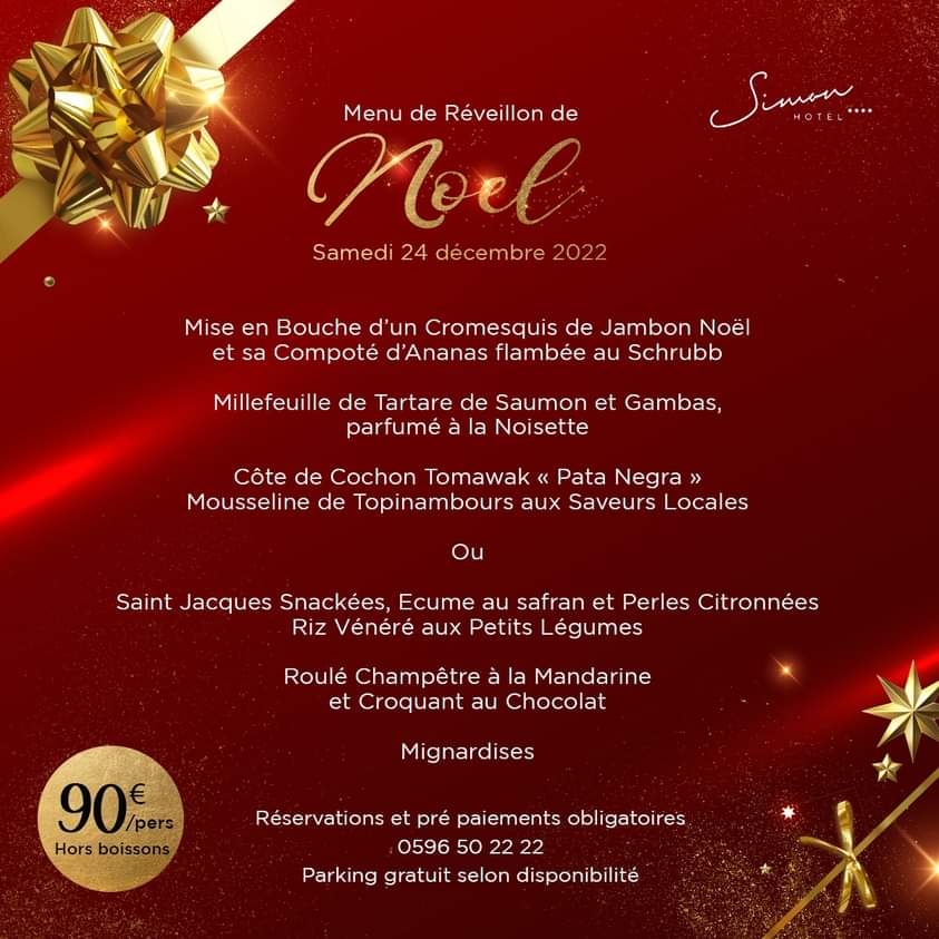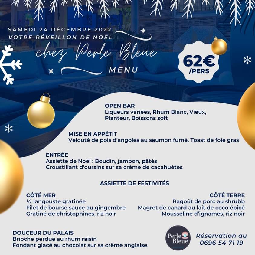 Le chef Michel à Grenade et Basilic à Sainte Luce vous a concocté un superbe menu pour le réveillon de la Saint-Sylvestre ! Au programme : animation musicale, explosion de saveurs en bouche et passage à la nouvelle année ensemble ! On commence par un foie gras au torchon, truffe et rhum vieux et sa salade paysanne aux lardons fumés puis des pétoncles au beurre noir sur son lit de taboulé 𝒐𝒖 Rillettes aux deux saumons. Un intermède sera proposé avec un trou caribéen au rhum vieux et glace coco. En plat vous aurez le choix entre un filet de bœuf, sa sauce au foie Gras et ses petits légumes 𝒐𝒖 un pavé de saumon et son émulsion de mangue au gingembre mariné et citron vert et son gratin de banane. En dessert ce sera une bûche glacée et coupe de champagne. Réservation au : 06 96 82 55 10 (acompte 50% obligatoire)