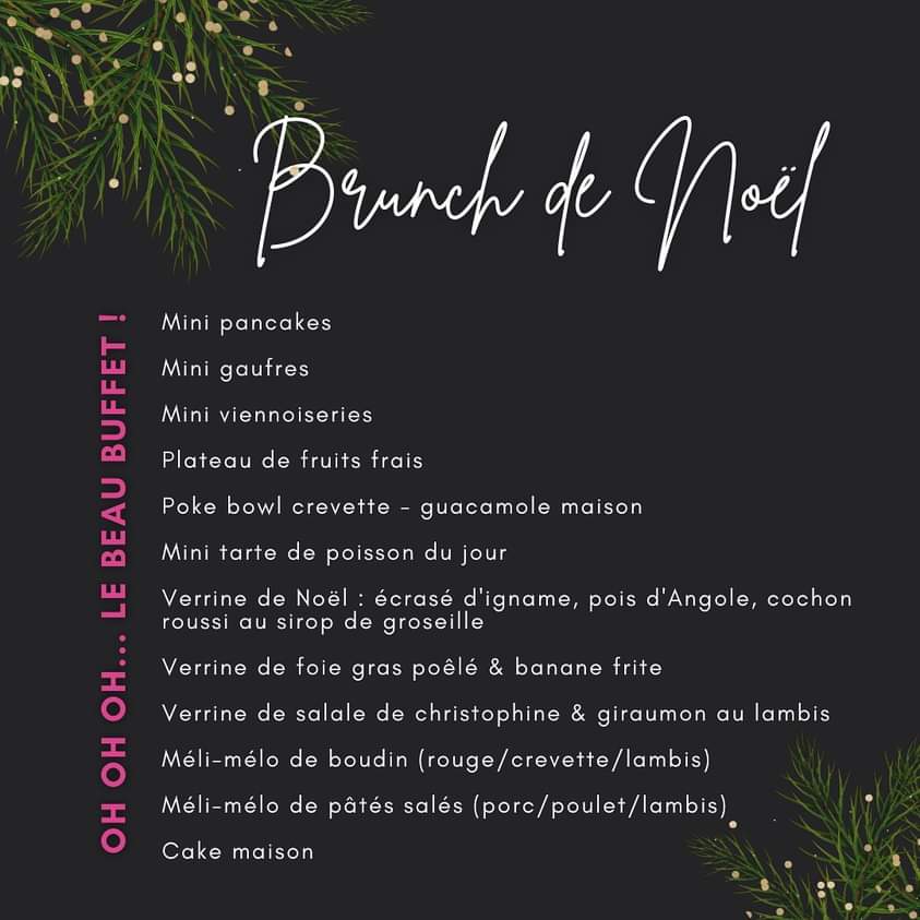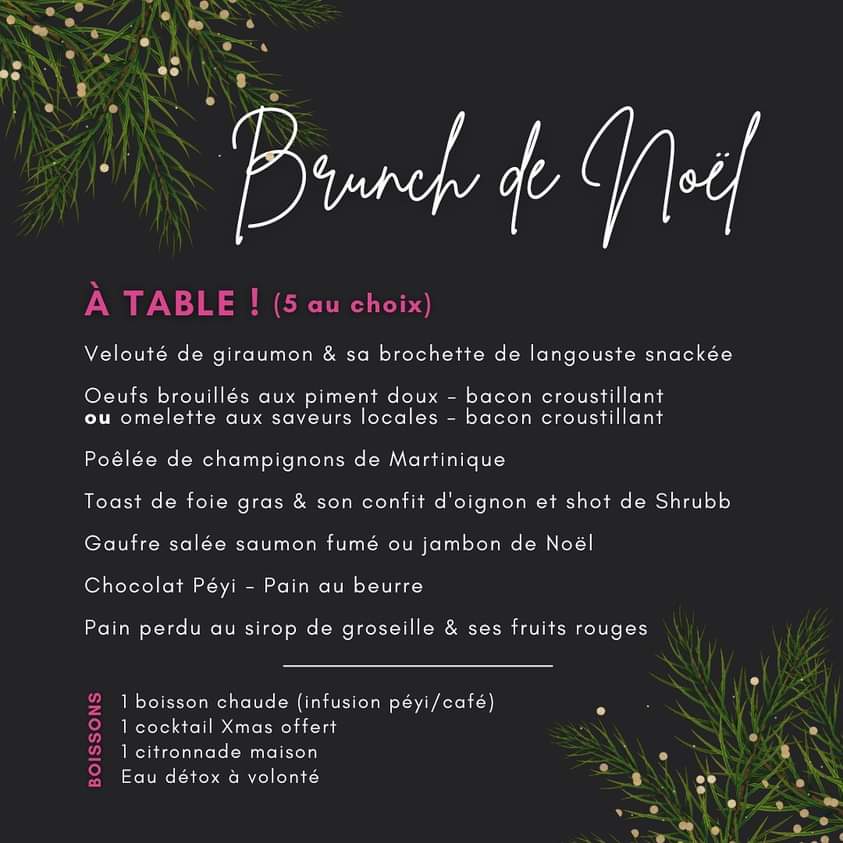 En famille ou entre amis, venez savourez le brunch de Noël de 9h à 15h, your place to be! Adulte 45,00 / Enfant (-12 ans) 20,00. Réservations au 0696 22 27 57.