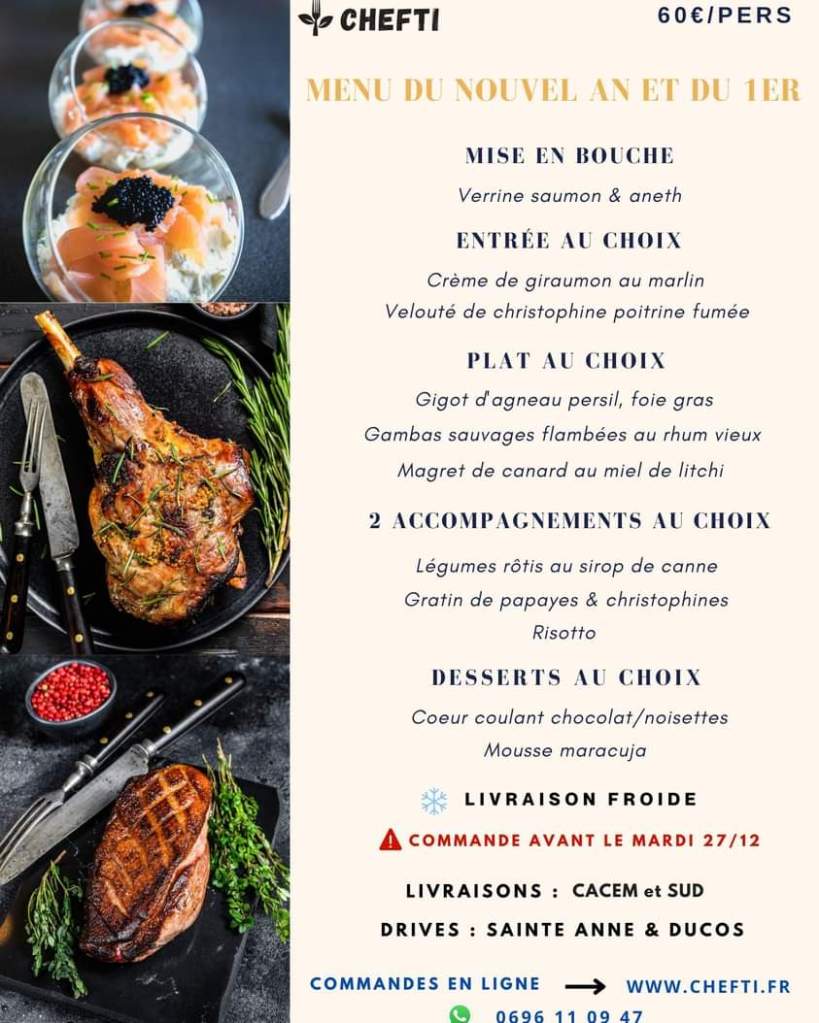 Le Chefti s’occupe de vous pour le 31, il cuisine pour vous et il vous livre sur la CACEM et le sud vous pouvez récupérer en drive à Sainte anne et à Ducos. Commande en ligne. Pour garantir une sécurité alimentaire parfaite, les repas sont livrés froids à réchauffer, ils peuvent être consommé le 1er également. Tarif 60€. Infos WhatsApp au 0696 11 09 47.