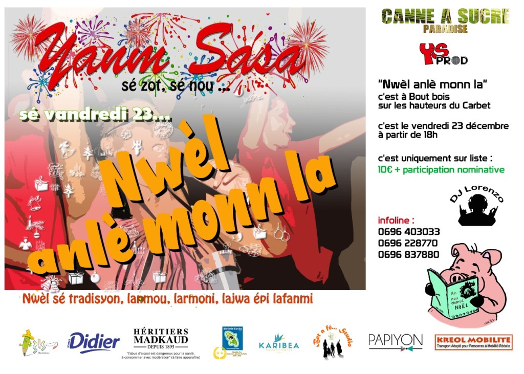 Dernier jour pour commander votre repas de noël (ragout de porc local, légumes pays et pois d’angole) à 15€ auprès de Tof traiteur au 0696 389 418. Le jambon de noël de 3kg est à 45€, les pâtés salés à 1€, les petits à 0.50€ et les bûches à 25€.