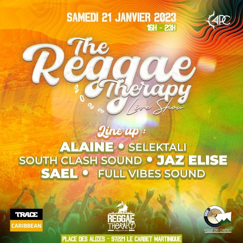 The reggae therapy se déroulera de 16h à 23h avec en line up Alaine, Selektali, South Clash Sound, Jaz Elise, Sael et Full vibes sound. Rdv à la place des Alizés au Carbet.
