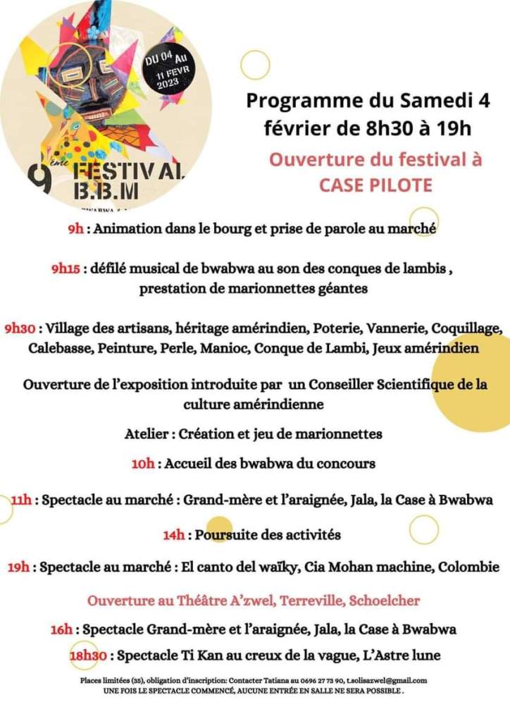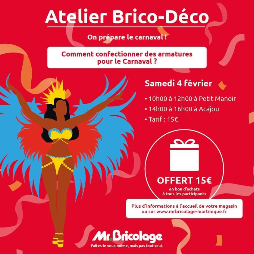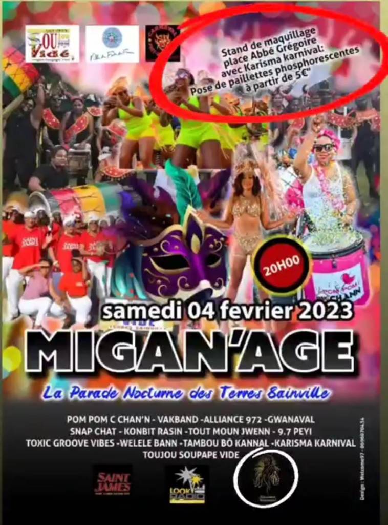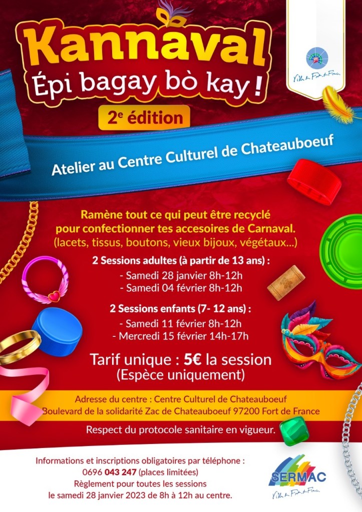 Le village du carnaval des enfants (accompagnés de leur parents) se déroulera de 14h à 18h au Boulodrome de Cité Lacroix avec la confection de masques, un atelier maré têtes de carnaval, freem et ses mascottes, des châteaux gonflables, un déboulé avec le groupe Turbulans, une animation musicale et un atelier maquillage. Inscriptions au 0696 05 60 61.