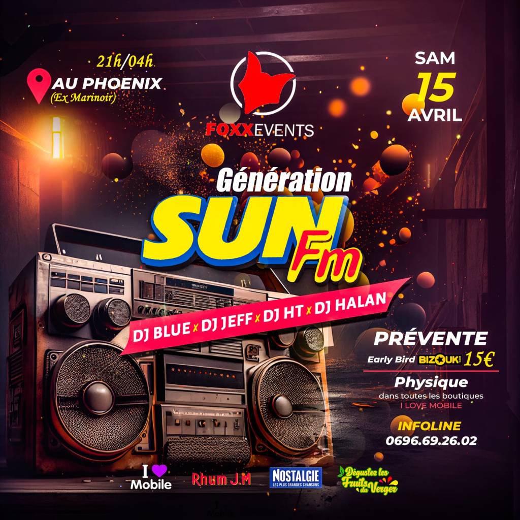 Ça y est ! La Génération Sun FM☀️🔥 revient le samedi 15 avril au Phoenix (Ex Marinoir) de 21h à 04h.