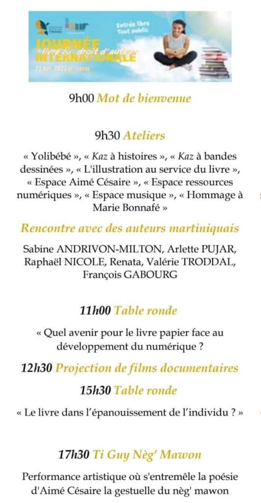 A la même heure, vous pourrez aussi vous rendre à la Bibliothèque Schoelcher pour une causerie avec l’auteur du livre « Les femmes de nos vies », écrit par Tania Lucéa et qui retrace le parcours des femmes de nos entourages. Infoline au 0596 55 68 30 si besoin.