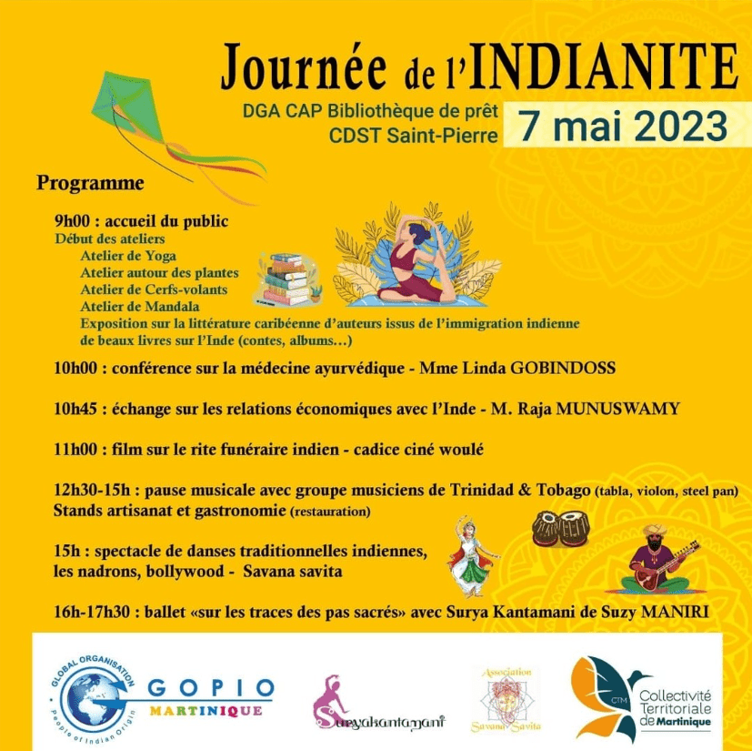 Ciné Woulé Company, Gopio Martinique, la CTM, l’association Savana Savita et la DGA CAP Bibliothèque de prêts sont très heureux de vous inviter à la Journée de l’Indianité le dimanche 7 mai 2023 à partir de 9h au CDST Saint-Pierre.
