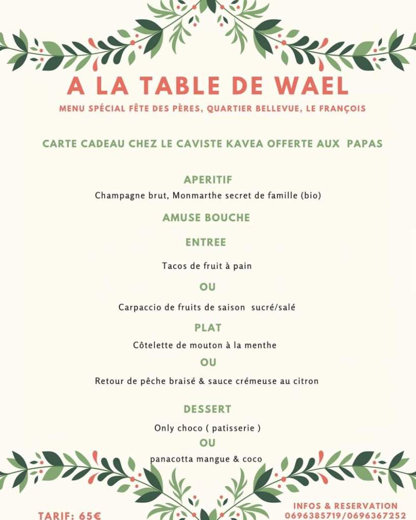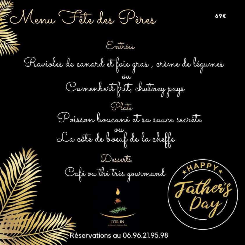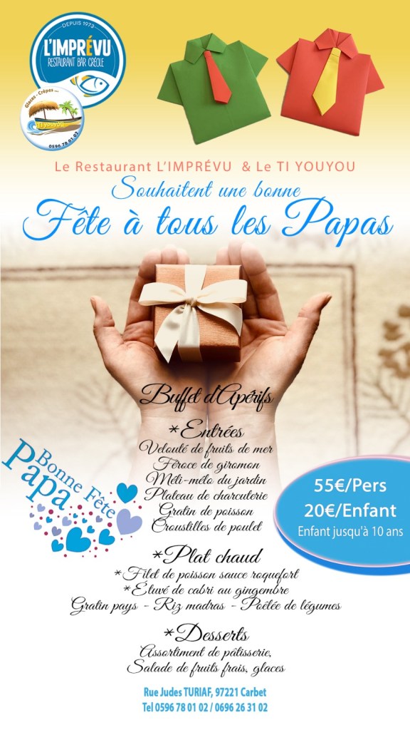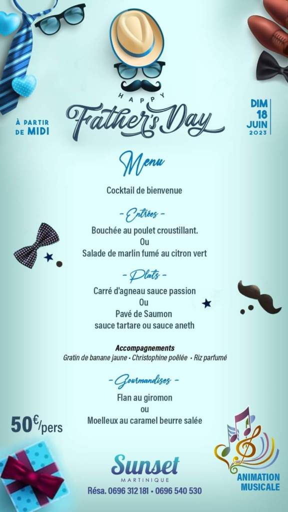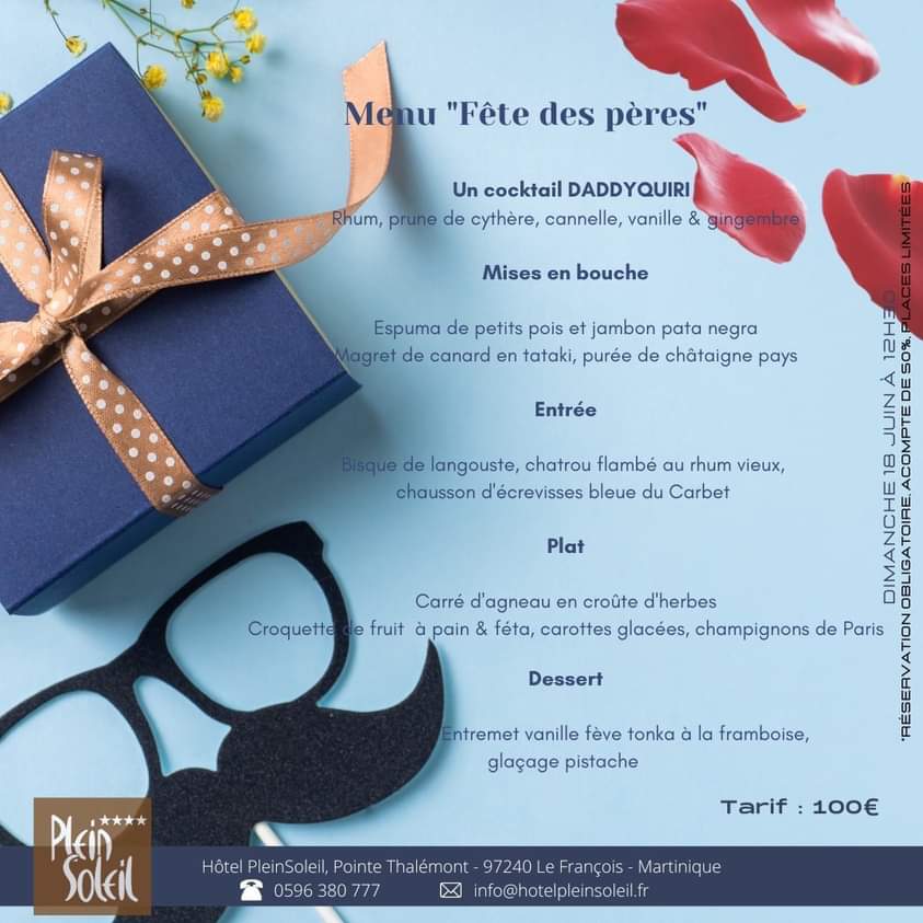 Wanted Paradise, à la nouvelle marina du Marin vous propose un menu à 49€. Réservation au 0696 53 51 78. La coupe de champagne est offerte aux papas.