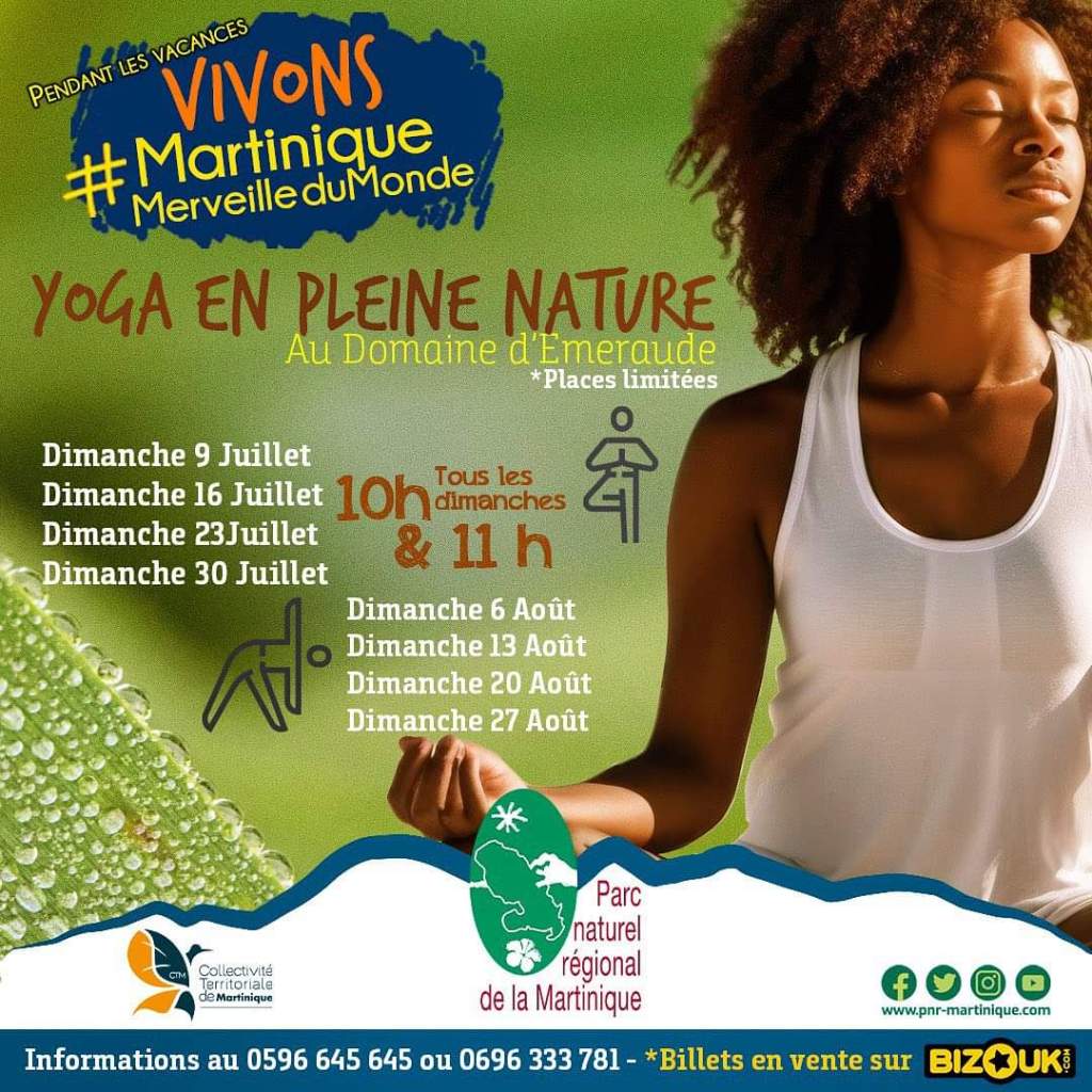 Tout au long des vacances le Parc Naturel Régional de la Martinique vous propose des séances bien-être au coeur d’un environnement naturel. Venez apprendre à respirer, à vous détendre, se relaxer, vous étirer et prendre soin de vous, quelque soit votre âge. Équipement à prévoir : tenue adaptée à la pratique du yoga (vêtements amples), tapis, et eau minérale. Informations 0595 645 645.