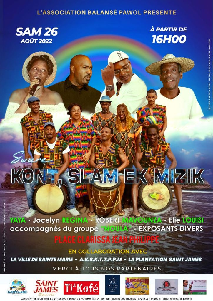 pour clôturer les vacances vous est proposé à Sainte-Marie. L’évènement « Kont, slam et mizik » organisé par l’association « Balansé pawol », garantit une soirée inoubliable placée sous le signe du conte, du slam et de la musique. Le rendez-vous