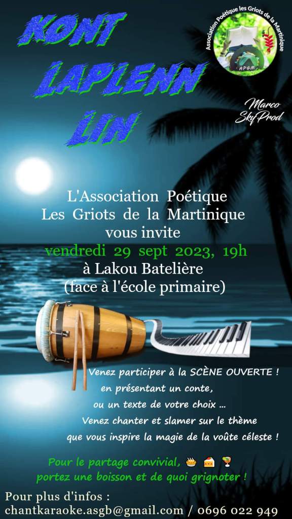 Une déambulation nocturne partira à 18h30 du rond point citron au Trois Ilets, à la découverte des richesses patrimoniales de la ville, avec Serge Pain, les hommes d’argiles, bel ti pa bèlè, Bèlè l’égliz, Laétitia Arrondel et Harry Diboula. Plus de renseignements au 0596 68 40 48.