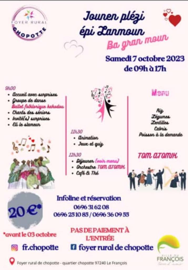 L’Ecolieu de Tivoli vous propose son mini marché avec pour thématique « Nourrir le corps et l’esprit ». Il y aura de la vente de fruits, légumes, plantes, artisanat et des ateliers de massages, sonothérapie et yoga de 8h à 12h. Contact au 0696 19 78 92.
