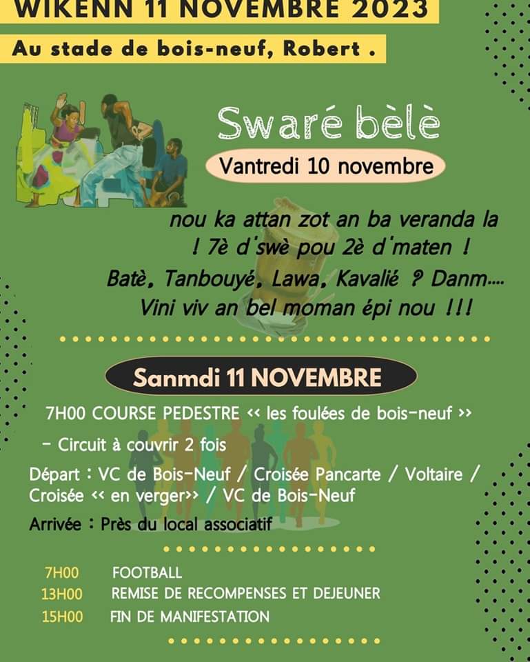 L’association ASC SIROCCO organise un tournoi de Belote le 11 novembre 2023 à partir de 18h sur le Plateau Sportif du quartier Plaisance. Les Inscriptions sont obligatoires. 1 Repas + 1 Boisson comprise. De nombreux lots à gagner. Pour plus d’informations au 0696 82 48 97 / 0696 32 26 37.