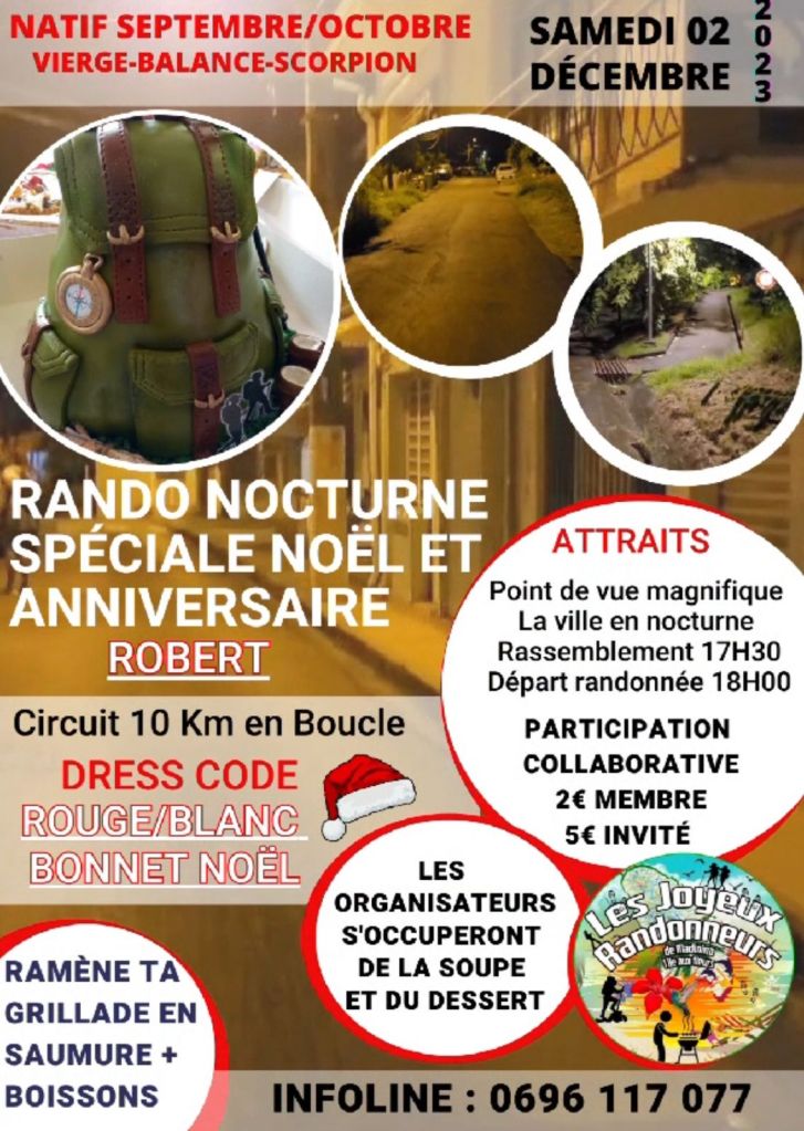 L’association Les Joyeux Randonneurs vous invite à leur 𝐑𝐚𝐧𝐝𝐨 𝐍𝐨𝐜𝐭𝐮𝐫𝐧𝐞 𝐒𝐩𝐞́𝐜𝐢𝐚𝐥𝐞 𝐍𝐨𝐞̈𝐥 𝐞𝐭 𝐀𝐧𝐧𝐢𝐯𝐞𝐫𝐬𝐚𝐢𝐫𝐞 samedi 2 décembre 2023.