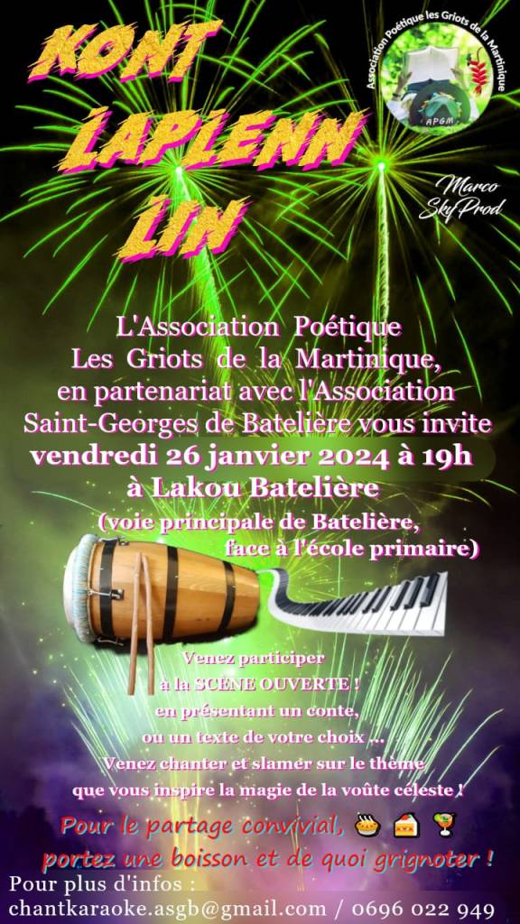 Les slameurs Mapie et Ven vous attendent à la Maison des créateurs à partir de 19h, dans le cadre des Vendredis de la cour. L’entrée est à 5€. Elle est située au 11 rue Martin Luther King. Infoline au +596 696 80 07 15.