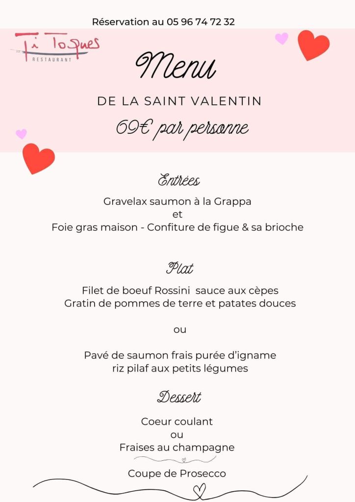 Le Yellow propose un dîner de Saint Valentin au 51 rue Victor Hugo.  Situé au cœur de la ville il propose un menu d’exception avec des ravioles de Saint Jacques, du risotto de langue d’oursin, du filet de grand yeux, un médaillon de veau fumé avec pour finir un entremet chocolat café cœur avocat bondamanjak et kir royal. Réservation au 0596 75 03 59.