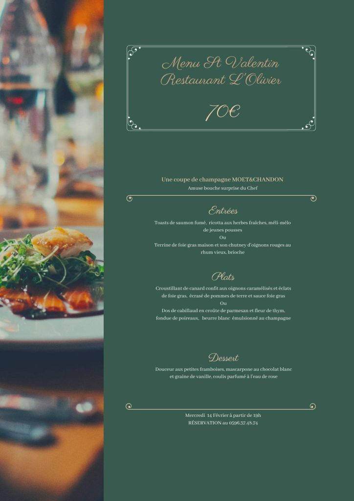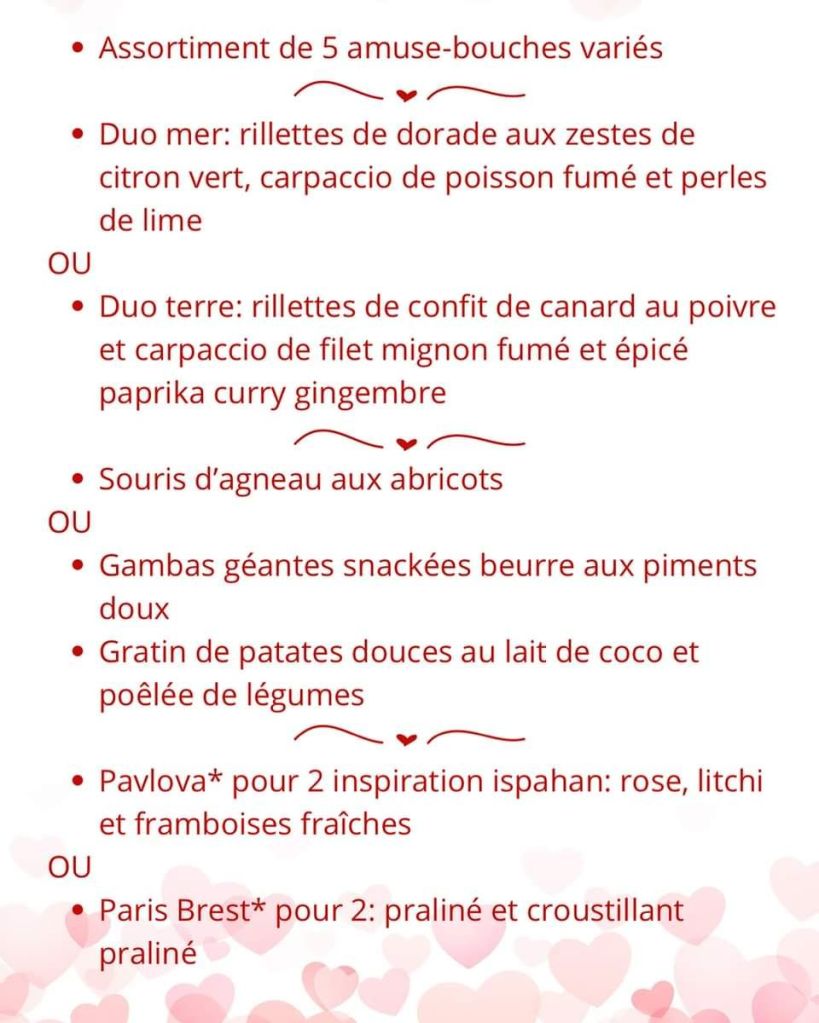 Une envie d’une soirée romantique ? La ferme des orchidées vous propose son menu sur réservation au 0596541085. Le tarif est de 110€ pour des assiettes pleine de gourmandises et d’amour à partager. Acompte 30% demandée à la réservation.