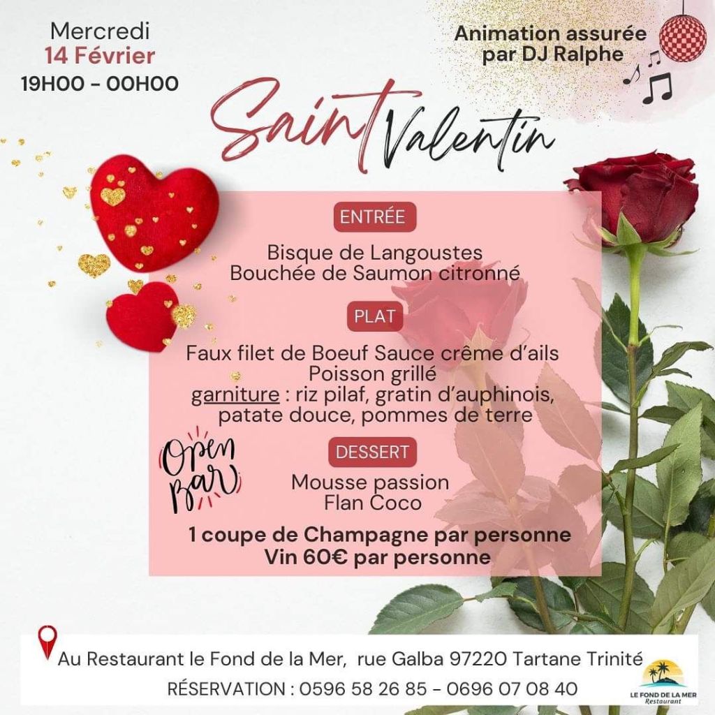 Le 14 février, soyez espiègles et embarquez votre bien-aimé(e) à bord du catamaran Hermès. Au programme : un concert cabaret de chansons coquines avec le groupe Des gars et des Garces. Départ du ponton de Grande Anse. 2 créneaux au choix : de 16h30 à 18h30 et de 19h à 21h. Prix pour 2 à 100€ comprenant 2 coupes de champagne, 1 assiette dégustation antillaise et 2 verres de planteur. Contact par WhatsApp au + 596 696 51 90 54.