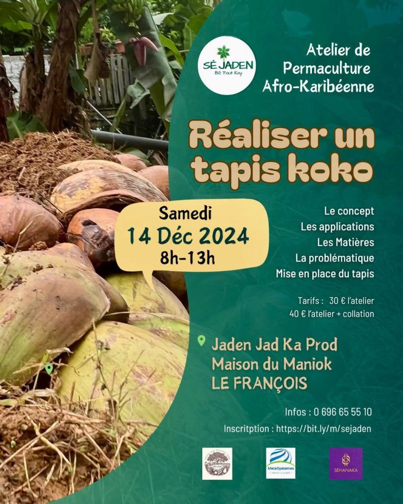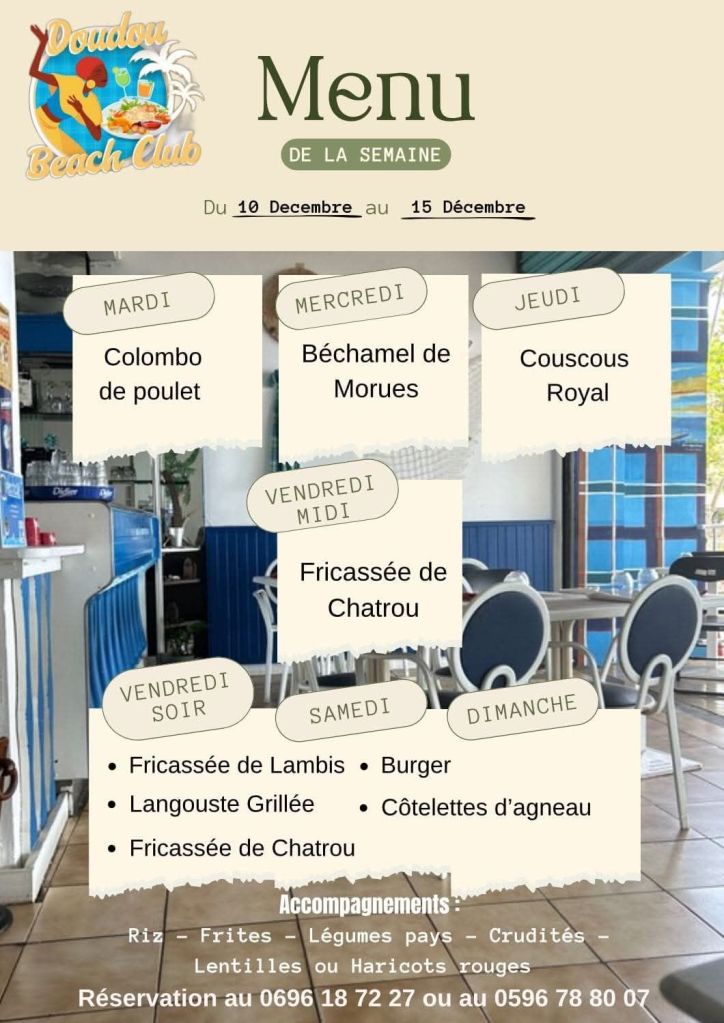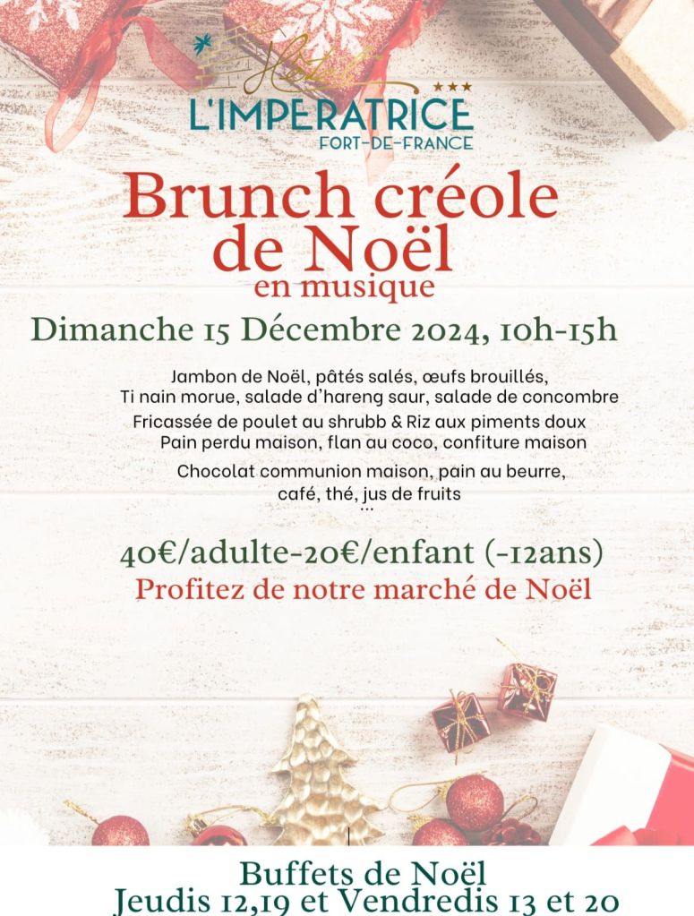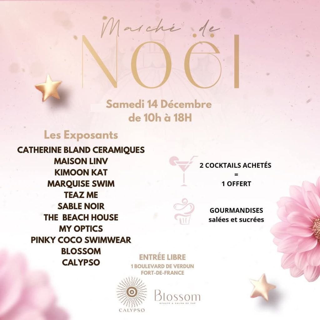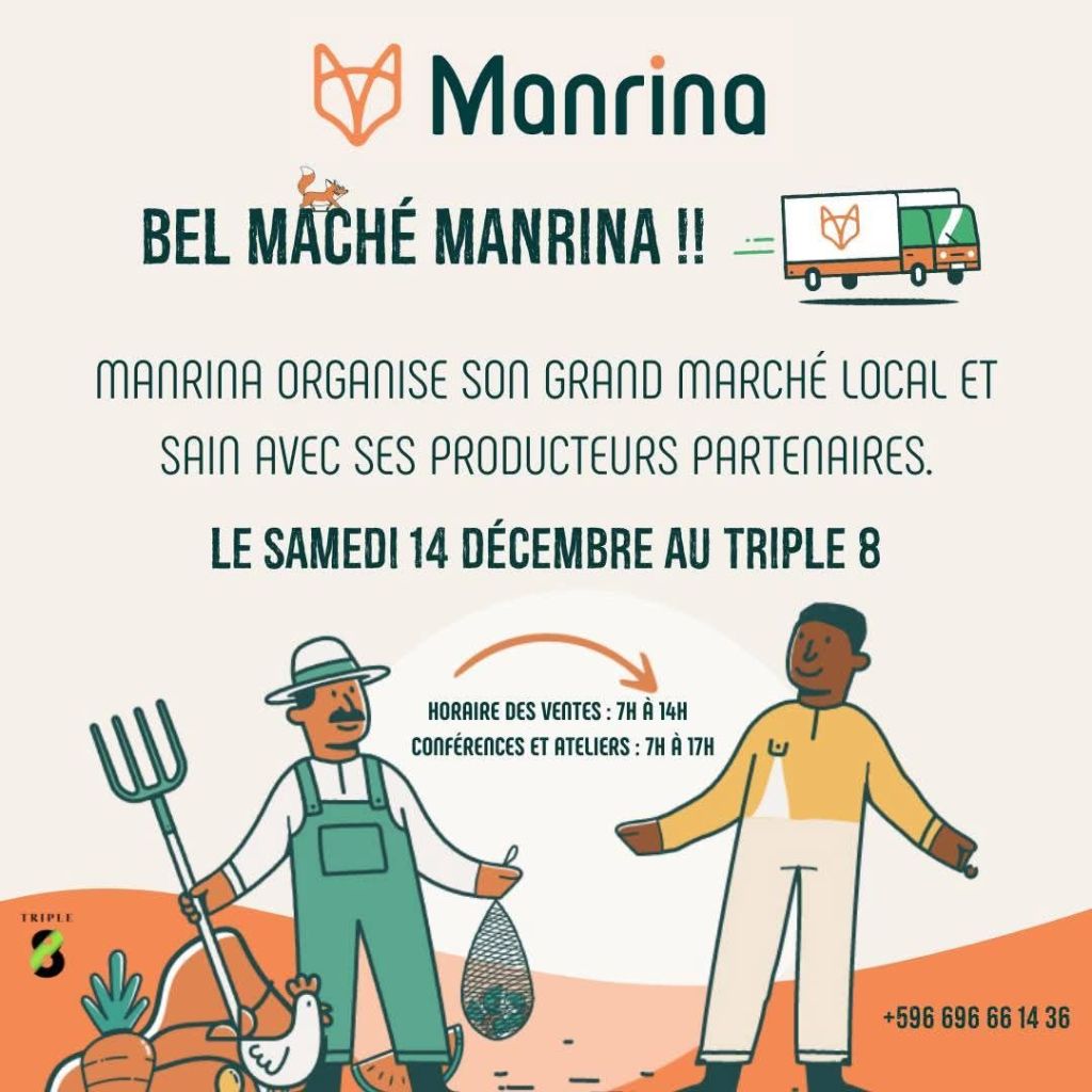 L’escale plézi & Maison Peyi vous invitent à leur marché de Noël de 8h à 16h au Village des dinosaures, face au Triple 8 à Génipa à Ducos. Vous trouverez des fruits et légumes, de la viande fraîche et locale de la coopmar, des jus locaux, du Kombucha et miel. De la rôtisserie, du poulet, des grillades, liqueur et jambon de Noël. Un grand chanté Noël vous sera également proposé dès 15h. Contact 0696 27 39 04.