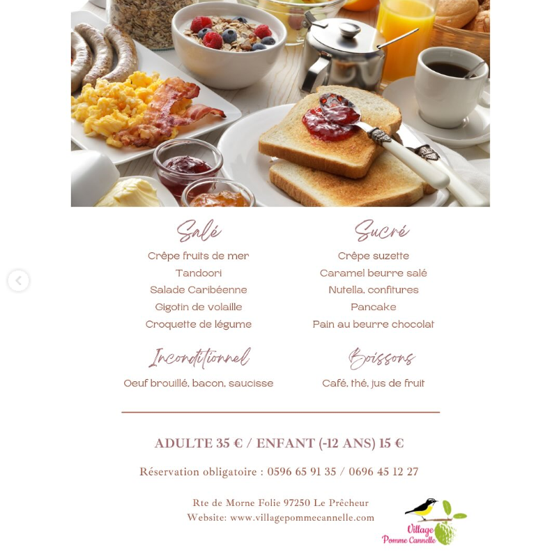 Le salon vous accueille pour vos brunchs le samedi et le dimanche de 8h30 à 13h en mode happy hour jusqu’à 10 personnes, au tarif de 29.90€ et de 34.90€ avec ou sans réservation. Attention ! La cuisine ferme à 12h. C’est à l’étage de l’atelier Tatie Maryse. Réservation au 0696 27 52 27.