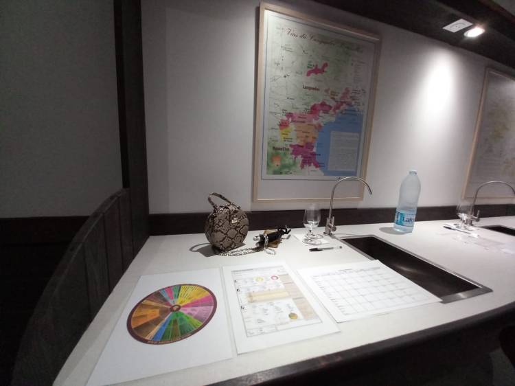 Sur chaque table de dégustation, il y a une fiche de dégustation à remplir, une roue de présentation des arômes sur laquelle s’appuyer lors de l’atelier, deux verres (à eau et à vin), une bouteille d’eau et un crachoir.