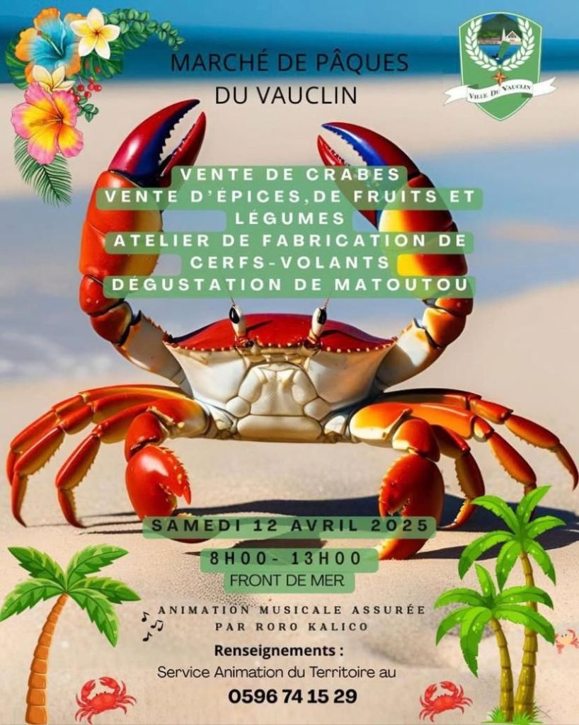 Le Marché de Pâques de Saint-Joseph vous attend de 7h à 15h au Bourg, Rue Eugène Maillard, pour un marché haut en saveurs et en traditions ! Produits locaux et spécialités pascales : fruits et légumes frais, épices, eau de coco, glaces artisanales, artisanat local… et bien sûr, vente de crabes pour vos plats traditionnels de Pâques ! Animations pour tous à 10h, danses Bèlè avec l’association AM4 et à 12h30, concert du groupe Ambiance 3D. Espace enfants de 9h à 14h avec château gonflable et jeux d’antan.
