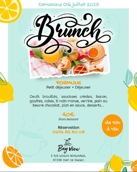 Direction le BRUNCH AMÉRICAIN du Petibonum ! Entre les pancakes dodus, le bacon croustillant et les œufs qui n’ont rien à cacher, ce brunch vous promet un 5 juillet plus savoureux que les discours de Trump. C’est de 9h à 15h. Tarif : 35€/adulte – 15€/enfant (jusqu’à 12 ans). Réservation conseillée au 0596 780 434.