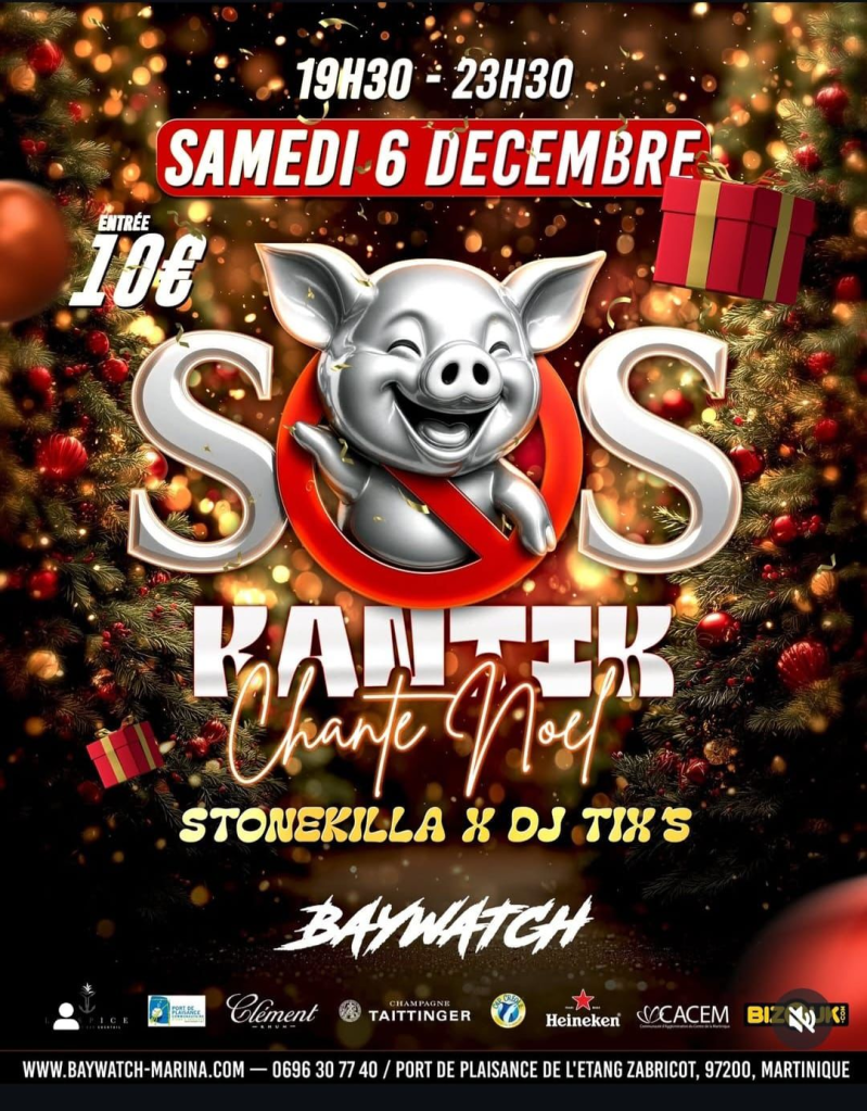 Ce samedi 6 décembre, on lève le niveau avec le Baywatch (Marina Etang Z’Abricot) et SOS Kantik ! Sur scène : Stonekilla, DJ Tix’s, du son, de la vibe, de l’émotion… De 19h30 à 23h30. Ambiance garantie.