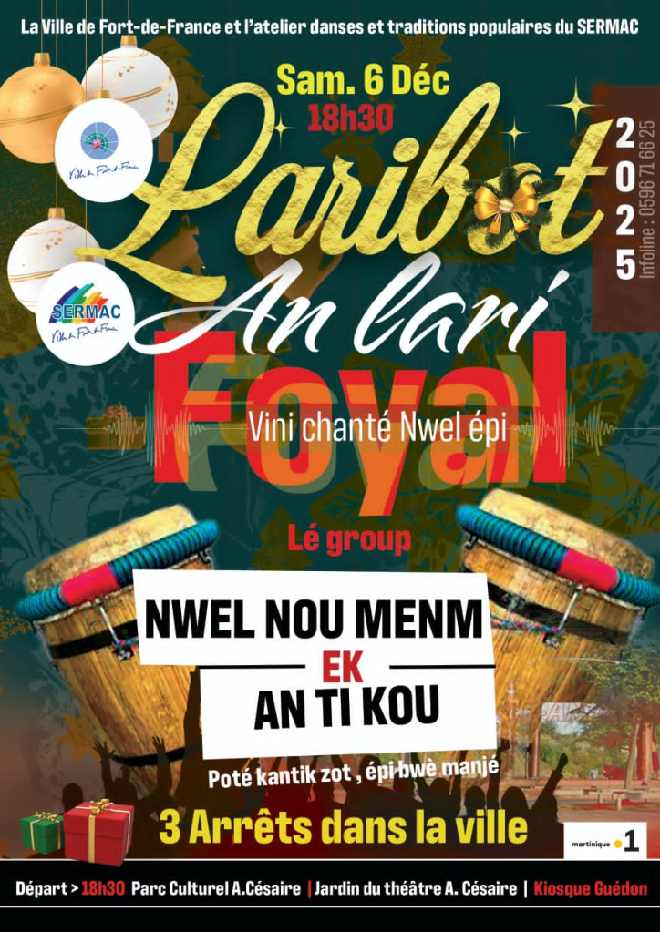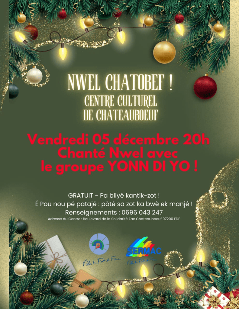 L’association FANMIY en lyannaj avec la Ville de Schoelcher vous propose un CHANTÉ NWEL » ansanm ansanm » avec le groupe CSP MIZIK. Rendez-vous au Terrain de pétanque de Fond Lahayé de 20h00 à 22h00. Pòté paté nwel, janbon, bouden, punch koko, soda, ji, la biè, dlo !